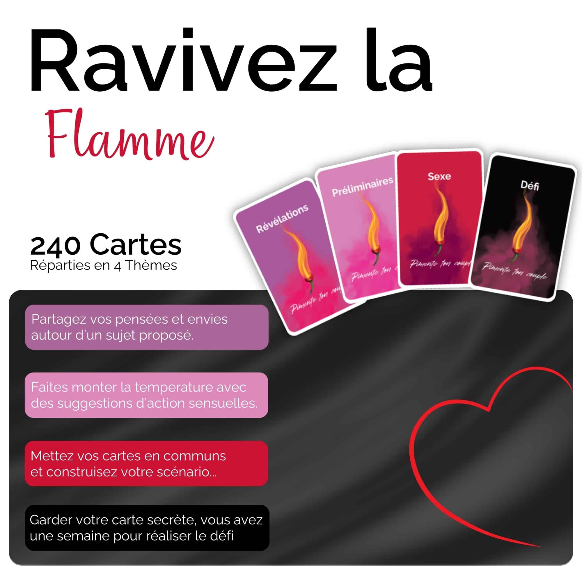 Créé par un couple passionné, ce jeu de cartes innovant est la solution parfaite pour briser la routine et raviver la flamme de l’amour.